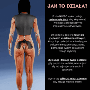 Pośladki PRO stymuluje mięśnie, poprawiając ich jędrność, siłę i wytrzymałość poprzez wywoływanie naturalnych skurczów mięśni.